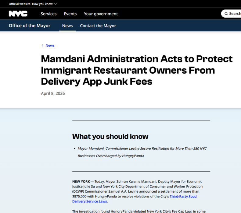 声明显示,“熊猫外卖”在2022年至2024年间,通过多种隐蔽手段系统性违反纽约市第三方外送服务费上限法规,对超过380家餐厅非法超收费用,其中多数为华人或亚裔移民经营的小型餐馆。