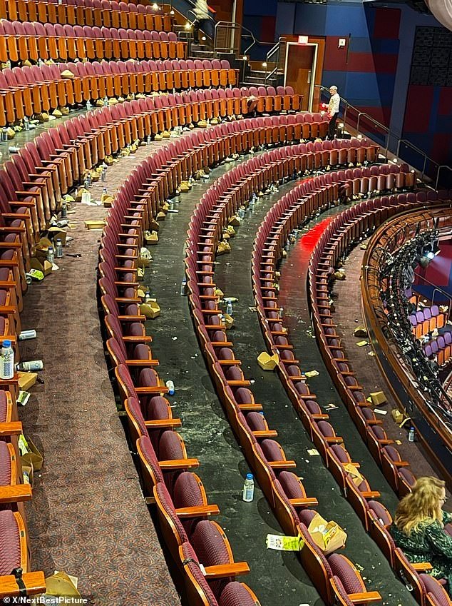 照片显示,剧院中上层座位区一片狼藉:成排的空水瓶、SkinnyPop爆米花袋、黑巧克力葡萄干包装纸、其他食品残渣随意丢弃在地板、座椅扶手和过道上。现场灯光亮起后,少数工作人员开始清理,但整体景象惨不忍睹,仿佛一场狂欢后的废弃战场。