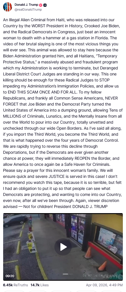 川普总统在Truth Social发了长文,并附上了没有马赛克的原始视频,他在帖文中写道:“一名来自海地的非法移民罪犯,被历史上最糟糕的总统——骗子乔·拜登和国会中的激进民主党人释放到我们国家,刚刚在佛罗里达州的一个加油站用锤子将一名无辜妇女殴打致死。”他警告称:“这段记录她惨遭杀害的视频,绝对是你见过的最令人发指的画面之一。”