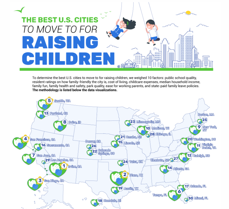 排名前五的城市依次为:1. 加州尔湾(Irvine, CA);2. 德州普莱诺(Plano, TX);3. 加州圣地牙哥(San Diego, CA);4. 加州旧金山(San Francisco, CA);5. 华盛顿州西雅图(Seattle, WA)。前五名中,加州占据三席,凸显西海岸在教育、安全和生活品质上的优势。圣地牙哥以宜人气候、多样亲子活动和相对均衡的生活成本脱颖而出;旧金山尽管生活费用高昂,但顶尖学校、科技创新氛围和家庭娱乐资源(如科技博物馆、湾区公园)为其加分;西雅图则受益于华盛顿州较为慷慨的带薪育婴假政策和户外活动机会。