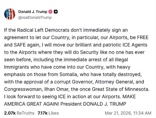 川普在多条帖子中猛烈抨击民主党人,指责他们“激进左翼”政策以“恶毒冷漠”伤害美国人民和国土安全官员。他写道:“激进左翼民主党人以其恶毒冷漠的手段伤害了太多人。他们对国土安全部、我们优秀的运输安全管理局官员,以及最重要的,我们国家伟大的人民所做的一切,简直是耻辱。”他进一步威胁称,如果民主党拒绝签署协议恢复机场和全国的安全措施,“美国移民及海关执法局(ICE)将会比以往任何时候都做得更好!”川普强调,ICE特工将执行“前所未有的安保工作”,包括“立即逮捕所有非法进入我国的移民,并予以严厉处罚”,并特别点名“那些来自索马里的人”,指责明尼苏达州民主党议员伊尔汗·奥马尔等人在当地“默许”相关问题导致该州“彻底摧毁”。
