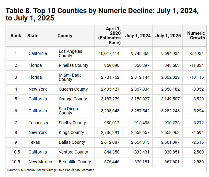根据美国人口普查局于3月26日公布的最新人口估算数据,洛杉矶县在2024年7月1日至2025年7月1日期间,人口净减少近5.4万人,成为美国所有县中人口绝对下降幅度最大的地区。