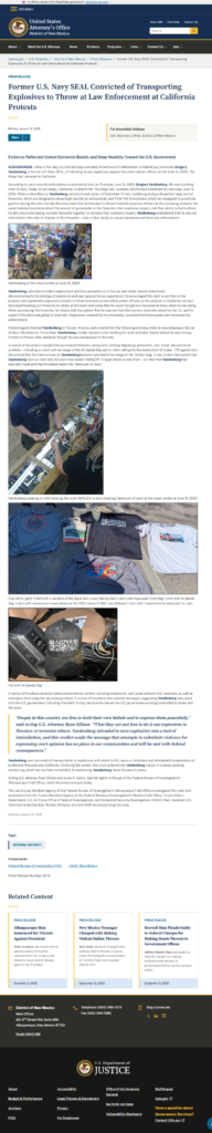 嫌疑人名叫格雷戈里·范登伯格(Gregory Vandenberg),近日在新墨西哥被陪审团裁定犯有两项重罪:跨州运输爆炸物意图杀人、伤人或恐吓,以及企图将违禁烟花运入加州罪。经过为期五天的庭审和约三小时的审议,陪审团一致判定罪名成立,面临最高10年的刑期。