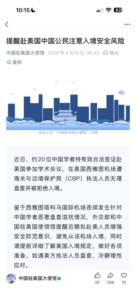 根据中国驻美大使馆最新通报,近日,约20位中国学者持有效合法签证赴美国参加学术会议,在美国西雅图机场遭海关与边境保护局(CBP)执法人员无理盘查并被拒绝入境。