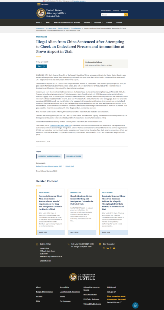 周五,犹他州地区法院法官霍华德·C·尼尔森二世(Howard C. Nielson Jr.)作出判决。此前,赵雪梅于2025年4月29日承认犯有“外国人非法持有枪支罪”(Possession of a Firearm by a Restricted Person – Alien),被判处一年刑期。